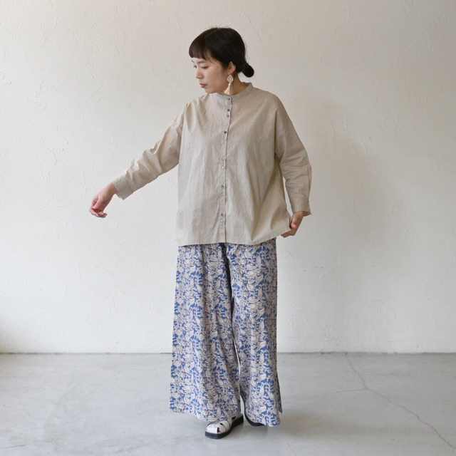 インドのカシミール地方が発祥とされる、ペイズリー柄。 2026年の春夏コレクション「Transit」より、この異国情緒あふれる伝統柄を存分に散りばめた抜け感抜群パンツが届きました。 生産国:インド(クリエイティブ・ハンディクラフト) 素材:綿 (オーガニックコットン)100% (azoフリー染料) サイズ:着丈93×ウエスト64-77×ヒップ115.6×わたり幅39.2×裾幅40.8cm ※ウエストサイズのみ実寸ではなく、対応サイズの目安を表記しております。 >> 衣料品のサイズについて << *ウエストゴム+紐仕様 ※ゴム替え口無し *両脇ポケット付き ※濃色はお洗濯やクリーニングの際、色落ちしますので他の物と分けて単独で洗って下さい。 ※洗濯後はすぐに脱水して干し、濡れた状態で放置しないでください。 このフレアパンツのポイントは、何と言っても両脇の裾に深めに入ったスリット。 裾を結べば、バルーンパンツ風にすることも可能なのです。 なんとも涼やかな足元! 夏の海などレジャーシーンにも大活躍です。 味わいのあるストライプ柄はスクリーンプリントという手仕事で生み出されています。 工場があるのは、インドのラジャスタン州にあるサンガネールという街。 サンガネールには木版プリントやスクリーンプリントの工場が並びます。