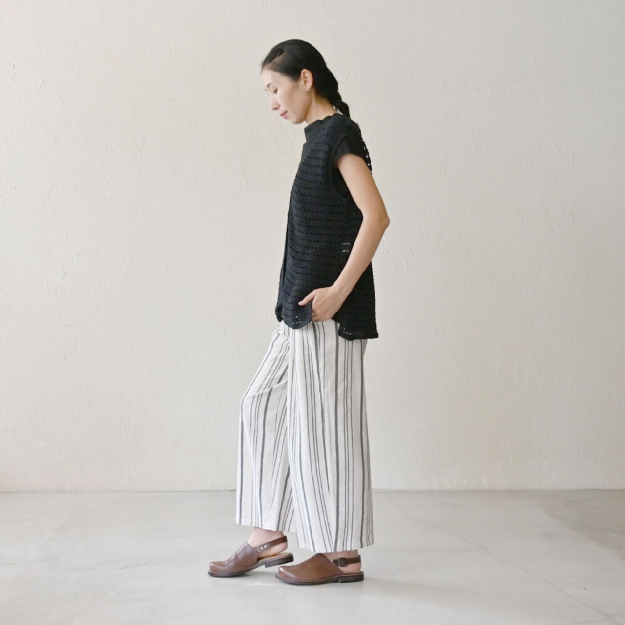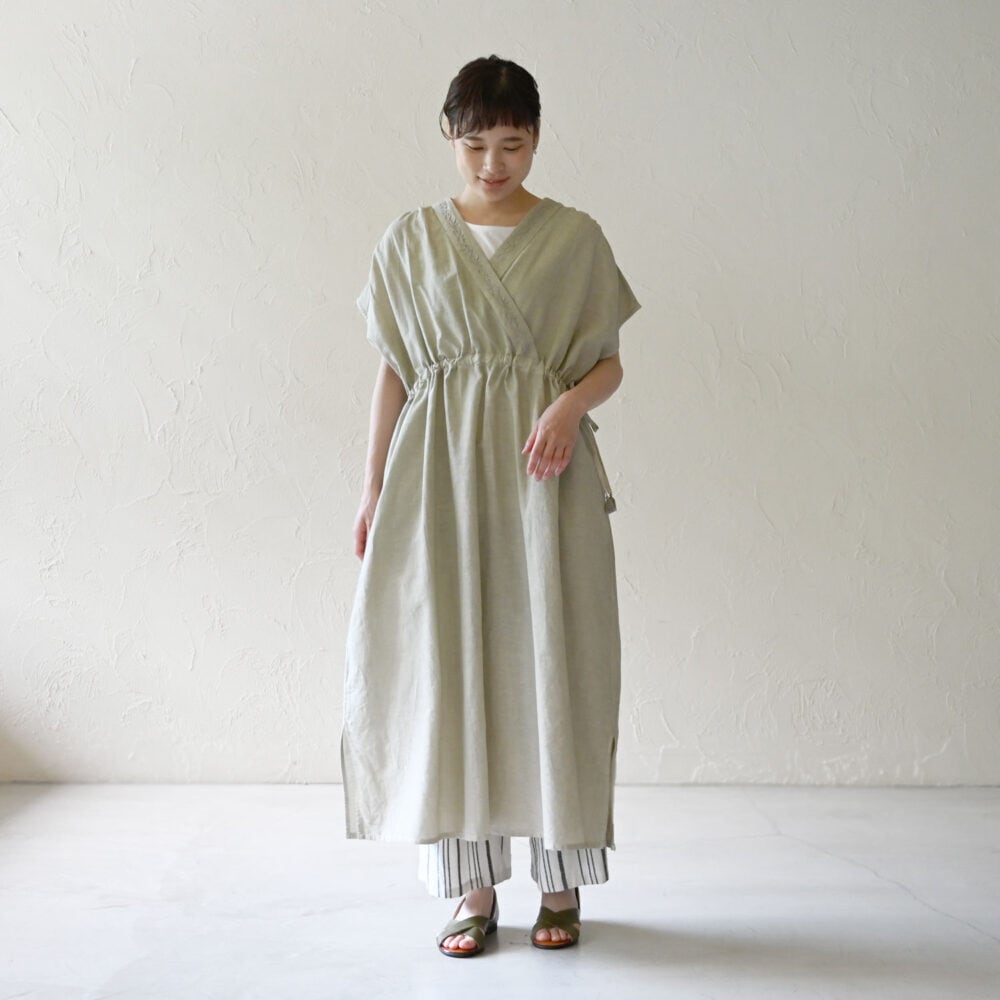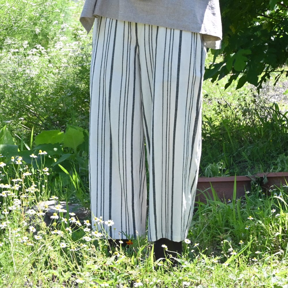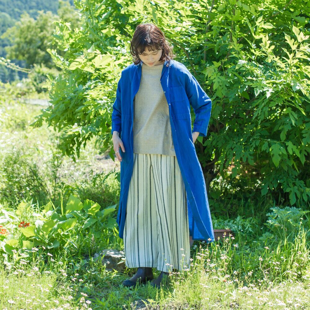 手織りのストライプ生地を存分に楽しめるよう、まっすぐストンとした形です。